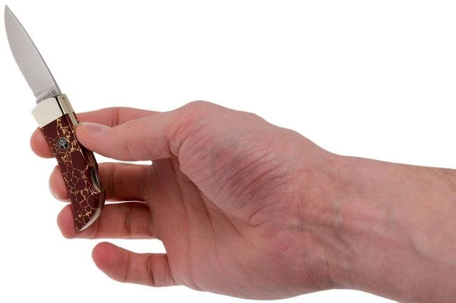 The Böker Pocket Tru-Stone 111015 is a compact and remarkable limited edition pocket knife. This version is enhanced with Tru-Stone scales. A remarkable composite material made from 85% stone, with coloured acrylic to hold the material together. Truly remarkable! And nicely polished. The hollow grind blade is made from 4034 steel. A simple stainless type of steel that is great for occasional use. You open the knife with two hands after which it is locked by a backlock.