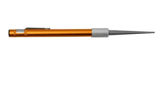 The Buck 97070 Diamond Pocket Sharpener is a small sharpening rod to sharpen your knives. The sharpening steel has a diamond coating with a grain size of 400 grit. Diamond is a lot harder than steel. It can easily sharpen steel. Another property is that diamond hardly gets clogged up with sharpening residue. You don’t add water or oil as you sharpen your knife. As such you don’t have to prepare anything before you start sharpening.