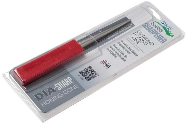 The DMT Small Diamond Cone is a small, conical diamond-coated sharpening steel to sharpen serrated knives and knives with a curved blade. Think of bread knives, spoon knives, blister knives and much more. The sharpening steel has a tapered diameter from 3 to 9 mm.