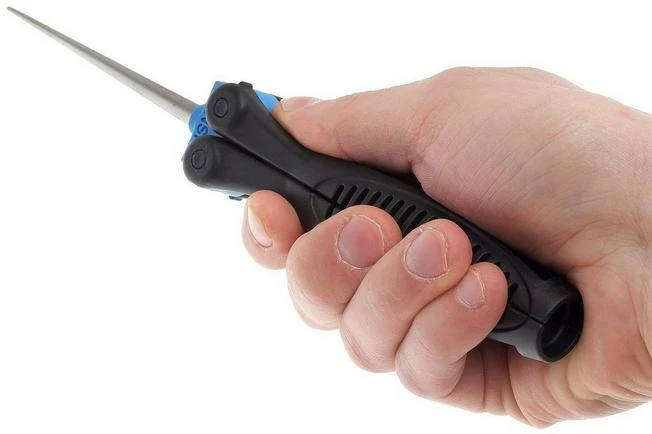 This conical sharpening steel is easy to carry because the handle folds around the sharpener. It is nice and compact while the sharpening surface is well protected when you are not using it. The handle is ergonomically shaped and fits comfortably in your hand. The back of the handle fits nicely together when the handles touch. This makes the handle very solid and it does not feel like two separate parts. This seems like a small detail, but increases the sharpening comfort enormously.