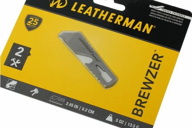 Small pocket tool with bottle opener and crowbar/screwdriver. The ‘ hook ‘ on the screwdriver can be used as box opener. It may not be suitable for someone who daily opens many boxes, but for occasional use, it will do just fine. Additionally, this tool features an open end wrench and a key for oxygen bottles. The ridges provide plenty of grip. It’s funny that Leatherman themselves only mentions two tools for the Brewzer: the crowbar and bottle opener.