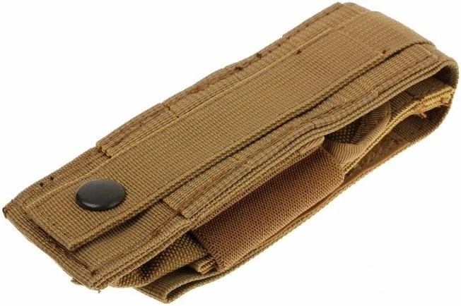 This heavy-duty nylon sheath is especially meant to attach to, for example, a backpack with a MOLLE-compatible mounting system. This is often used in the tactical world.