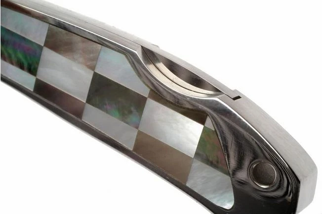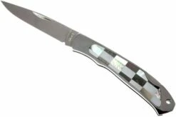 Moki Lockback. 3 5/16″ closed. Mirror polished AUS-8 stainless blade. Polished stainless handles with checkered white mother of pearl and black mother of pearl inlays. Lanyard hole. Genuine leather sheath